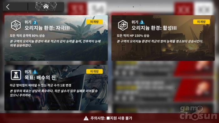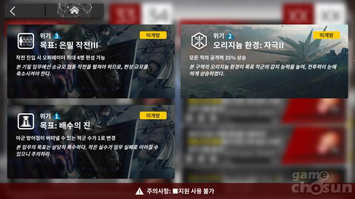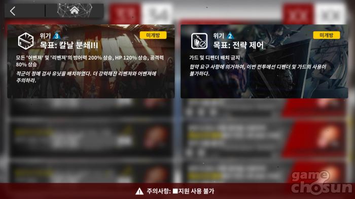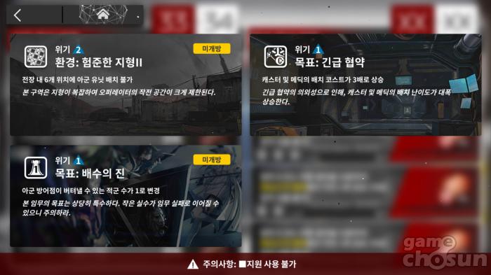 이번엔 10개 위치 아군 유닛 배치 불가, 모든 적의 체력 60% 상승, 아군 방어점의 적군 방어 수 1명이다. 언덕 구역은 한 곳 빼고, 그것도 방어선에서 가장 먼 1시 구역 하나다. 협약 도전1에 이어서 메딕과 캐스터, 스나이퍼까지 사용하기 어려운 스테이지라서 디펜더와 가드를 중심으로 운용해야 한다.