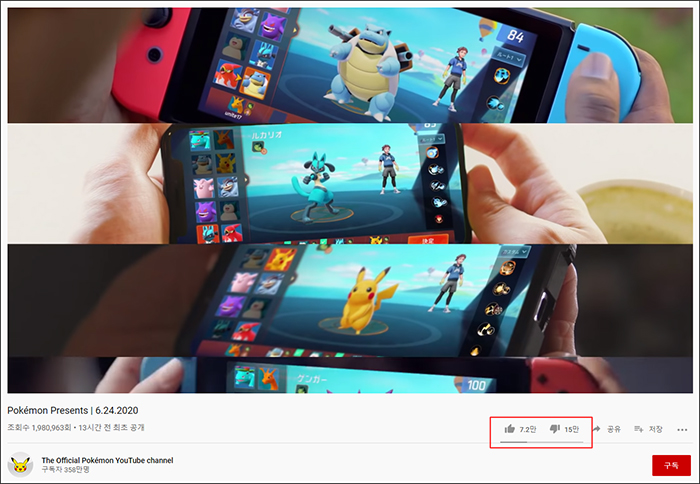 좋아요 대 싫어요 비율이 1:2을 이루고 있다 = 북미 공식 포켓몬 유튜브 채널