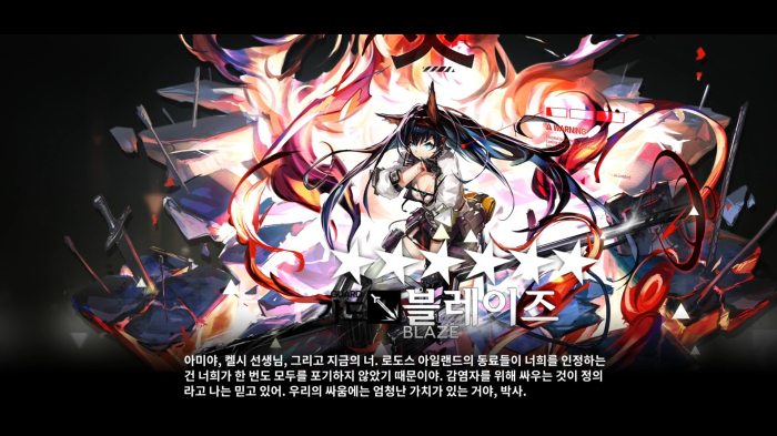 6성 가드 오퍼레이터 '블레이즈'는 이번 6지역 에피소드의 주역이다. 로도스 아일랜드의 정예요원으로 등장한 블레이즈는 리유니온에게 포위된 첸 구출 작전에 투입돼 수많은 병사를 한 번에 날려버리고, 다른 오퍼레이터들이 대응하지 못했던 적 간부 '파우스트'를 완벽하게 막아내는 등 눈부신 활약을 보여준다.