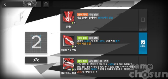 두 번째 스킬은 공격력과 방어력, 사거리 수치를 높여주는 '전기톱 연장 모듈'이다. 가드가 갖춰야 할 모든 능력치를 상승시켜주며, 지속 시간이 무한이라는 파격적인 효과를 가지고 있어 가장 범용적으로 쓸 수 있는 스킬이다. 다만, 스킬 발동에 필요한 SP가 매우 높기 때문에 블레이즈를 초기에 배치하지 않으면 스테이지 종료까지 스킬을 사용하지 못하는 경우도 생긴다.