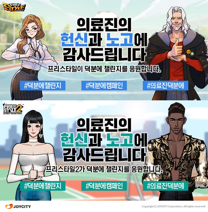 조이시티 신룡길 사업팀장은 “코로나19의 종식을 위해 밤낮으로 애쓰시는 모든 의료진과 방역 당국에 조금이나마 힘이 되어 드리고자 ‘덕분에 챌린지’에 동참하게 되었다“며, “특히 이번 캠페인을 통해 ‘프리스타일 1,2’의 유저 분들과 함께 응원의 목소리를 모을 수 있어 더욱 의미가 깊다”고 전했다.