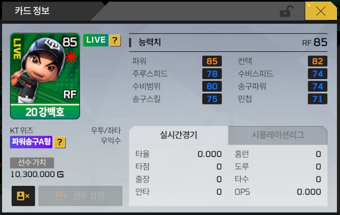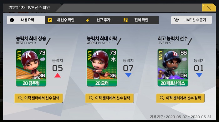 ‘마구마구2020 모바일’의 라이브 카드는 KBO 경기 기록에 따라 선수 능력치가 변동되는 카드다. 특정 등급은 없지만 능력치 분포가 매우 다양하고, 실제 프로야구와 연동되는 재미를 느낄 수 있다. 라이브카드는 2주마다 성적이 업데이트돼, 이용자는 지금 부진하더라도 좋은 성적이 예상되는 선수를 영입해 육성하는 등의 재미를 경험해볼 수 있다.