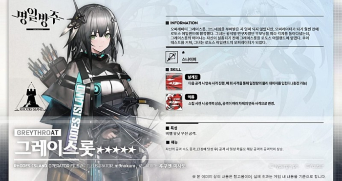 요스타의 모바일 캐릭터 디펜스 '명일방주'에 등장하는 '그레이스롯'은 범용적인 5성 스나이퍼다.