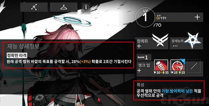 일반적으로 명일방주에 등장하는 오퍼레이터는 등급이 높을수록 좋은 성능을 보여주지만, 때론 낮은 등급 낮더라도 독특한 능력을 가지고 있어 강한 모습을 보여주는 오퍼레이터도 있다. 공격 범위가 돋보이는 4성 스나이퍼 엠브리엘이 바로 이 경우다.