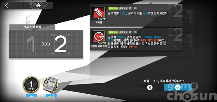 두 번째 스킬 '레이더 위치 추적'은 일정 시간 동안 공격력이 상승하고, 공격 속도가 줄어드는 동시에 공격 범위가 스테이지 전체가 되는 스킬이다. 즉, 사거리가 일시적으로 무제한이 된다는 것이다. 기본 사거리 밖에 있는 적을 공격할 땐 공격 준비 동작이 커지는 단점이 있지만, 공격력 상승 폭이 매우 높고, 적의 움직임을 멈추는 재능도 비교적 자주 사용할 수 있다.