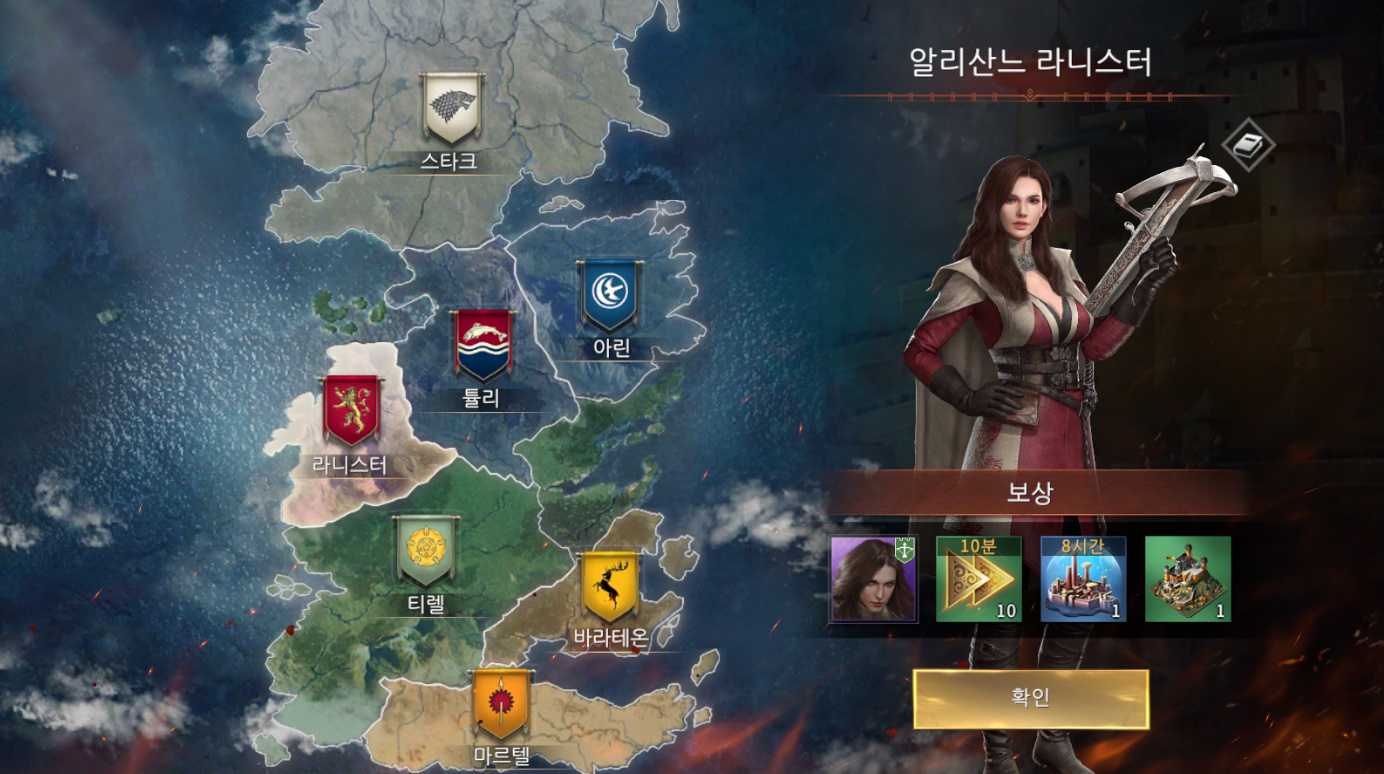 게임에 접속하면 가장 먼저 만나게 되는 것은 마치 실사를 방불케 하는, 그리고 드라마의 장면을 떠올리게 하는 화려한 프롤로그 영상이다. 프롤로그에서는 스타크 가문과 타르가르옌 가문이 동맹을 맺었음을 알리고, 라니스터 가문과 전면전을 펼칠 것을 암시하고 있다.