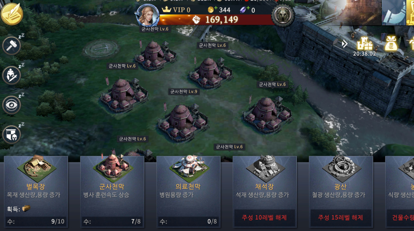가문까지 선택하면 이제부터 이용자가 가꾸어 나갈 웅장한 영지가 모습을 드러낸다. 초반에는 영지의 모든 건물을 활용할 수 없지만 점차 거대한 성으로 변해가면서 위용을 자랑하게 된다. 성의 외곽에는 농장와 목재소, 채석장, 광산 등을 건설해 물자를 확보할 수 있으며 성 내부에서는 병력을 육성하고 각종 연구를 진행한다.