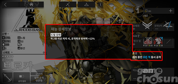 브로카의 재능은 적 두 명 이상 저지 시 공격력과 방어력이 12% 상승하는 효과로 광역 가드에게 더할 나위 없이 적합하다. 기본 저지 가능 숫자가 두 명이라서 별다른 육성 없이 특성 효과를 온전히 받을 수 있는 것도 장점이다. 다만, 단일 적을 상대로는 재능 효과를 발휘하지 못하기 때문에 각 지역 마지막 스테이지 보스전에서는 다소 힘이 빠진다.