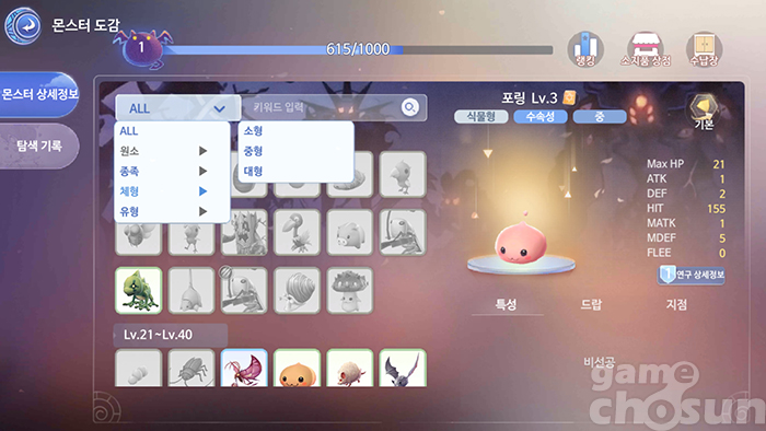 크기에 따른 피해 배율과 각 스킬의 특성을 파악했다면 도감을 열어 자신에게 적합한 몬스터를 검색하자. 검색할 때는 위에서 알아본 크기 배율과 속성을 기준으로 검색하되 몬스터 레벨도 주의 깊게 살펴봐야 한다. 몬스터와 캐릭터의 레벨 차이가 심하게 날 경우 경험치 획득량이 최대 30%까지 떨어지기 때문이다. 경험치 효율을 최대한 높이고 심다면 캐릭터 레벨보다 1~10 높은 몬스터를 사냥해 경험치와 아이템 획득 배율을 극대화하자.