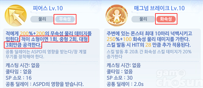 또한 나이트의 스킬 중 '피어스'는 소형에게 1회, 중형에게 2회, 대형에게 3회 피해를 입히기 때문에 대형 적을 사냥하기 적합하며, '매그넘 브레이크'는 화속성 판정을 가지고 있으며, 발동 후 20초 간 화속성 스킬 피해가 20% 증가하기 때문에 지속성 몬스터를 사냥할 때 유용하다. 만약 자신의 주력 스킬이 무속성일 경우에는 무기에 일정 시간 동안 속성을 부여하는 '컨버터'를 이용해 피해를 높이면 된다.