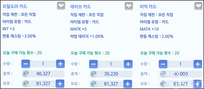 방어구는 마법 피해를 높여주며, 변동 캐스팅을 줄여주는 '견습 마법사 세트', 혹은 무속성 피해를 줄여주는 '낙원단의 증명 세트'를 착용해 생존력을 챙기면 된다. 착용 카드는 각종 MATK 상승 카드와 함께 변동 캐스팅을 줄여주는 '프릴도라'와 '미믹', 마법 대미지를 높여주는 '레이쓰' 등을 추천한다.