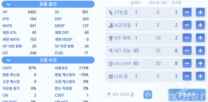 위저드의 주요 능력치는 INT와 DEX다. INT를 높이면 MATK가 상승하며, DEX를 높이면 변동 캐스팅%가 줄어든다. 두 가지 모두 위저드에게 중요한 능력치라서 위저드를 처음 플레이하는 이용자는 어떤 곳에 포인트를 투자해야 할지 고민하는 경우가 많다.