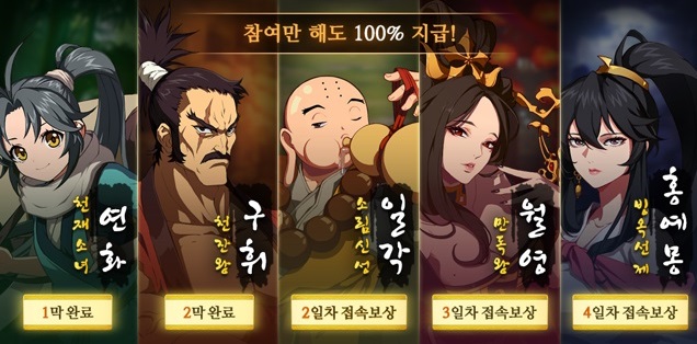 먼저 신규 유저 출석미션으로, 테스트 기간 동안 매일 접속 시, 2일차 ‘일각’, 3일차 ‘월영’, 4일차 ‘홍예몽’ 등 원작의 핵심 주인공 영웅을 모든 유저에게 100% 지급하며, CBT때부터 ‘천하비무대회’ 토너먼트도 개최하여, 최종 16강 진출자에게 정식 런칭 시 사용가능한 명예스러운 아이템이 지급된다.