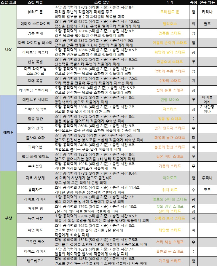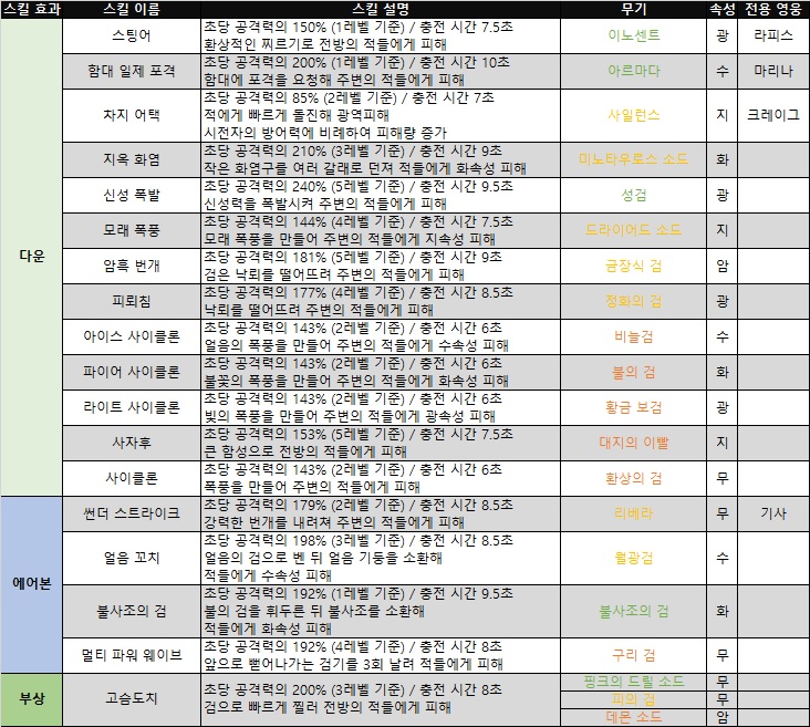 전용 무기는 장기적인 목표로 잡고 육성해야하는 만큼, 전용 무기를 획득하기 전까지는 파티 내의 연계기 조합에 따라 운용하는 것이 가장 좋다. 따라서 각 무기가 가진 스킬 타입이 어떤 것인지를 파악하는 것이 급선무다. 이에 게임조선은 한손검부터 클로까지, 총 8종 무기 타입의 스킬을 에픽 등급부터 유니크 등급부터 알아봤다.