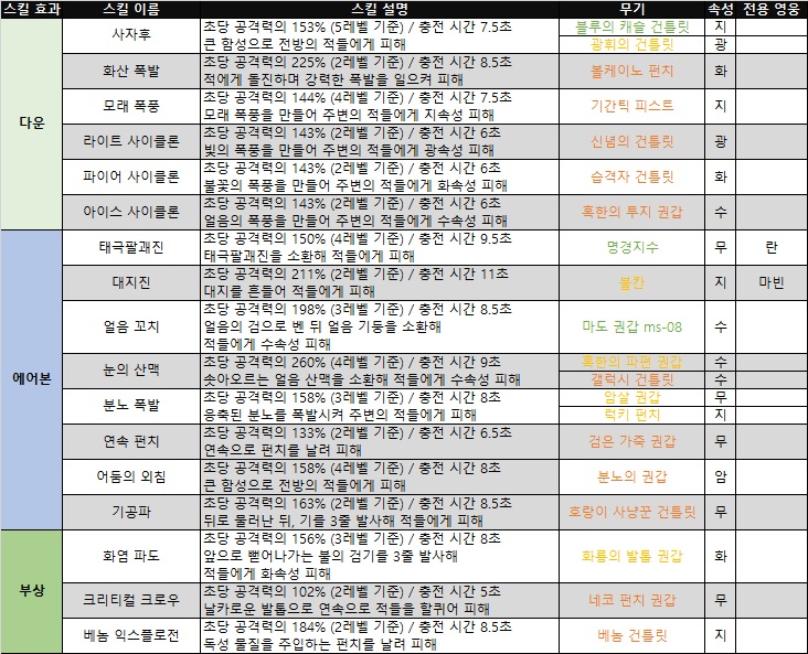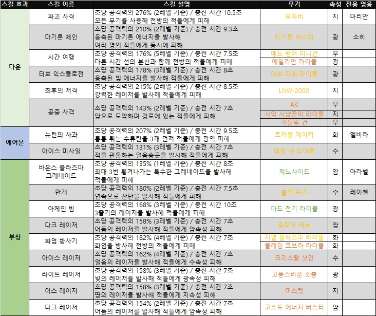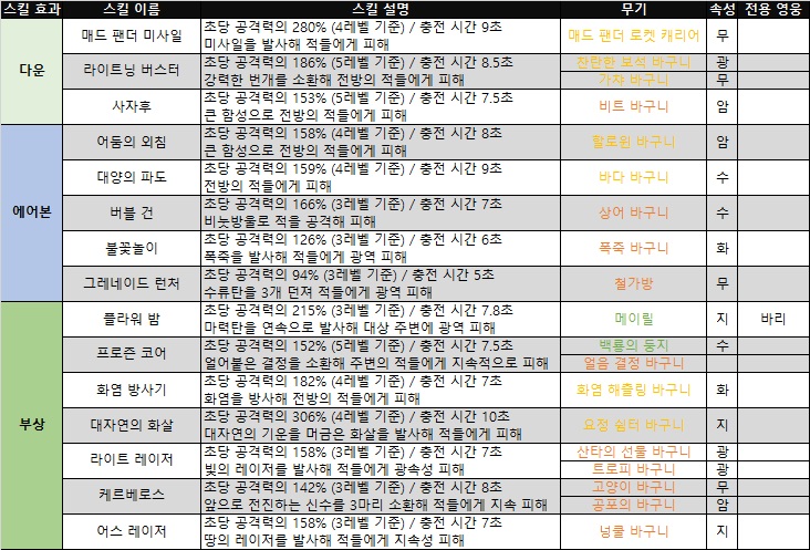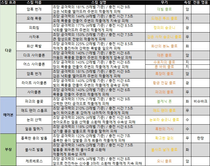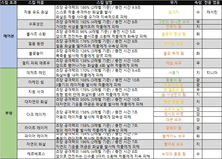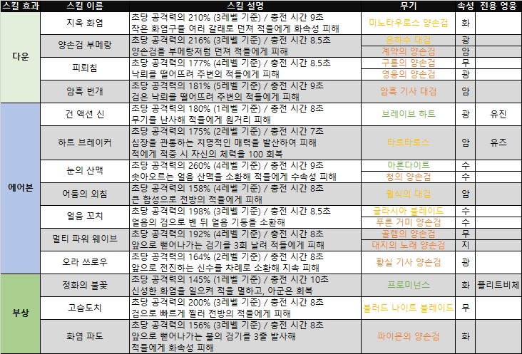 즉, 자신이 육성 중인 주력 영웅의 전용 무기를 입수하지 못했다고 하더라도 각 무기가 보유한 무기 스킬을 확인하고 자신에게 맞는 무기를 선택해 활용할 필요가 있다. 더 나아가 연계기에도 영향을 주므로 파티 편성에 있어서 무기 선택은 매우 신중해야 한다. 물론 각 영웅에 맞는 전용 무기를 선택하는 것이 베스트.