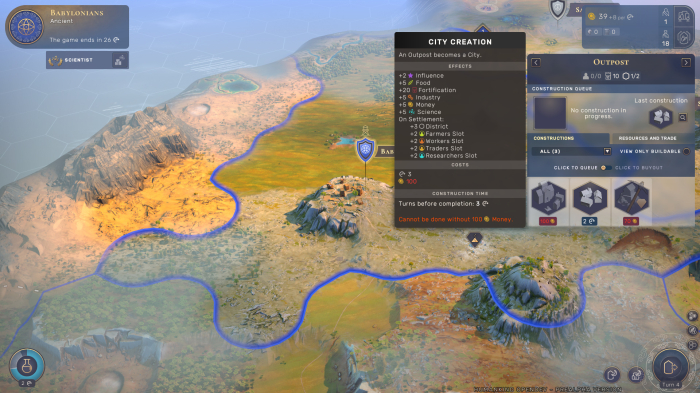 반면, 확장 방식은 조금 달라졌다. 전작의 경우 확장 전용 유닛을 소모해 도시를 만들었지만, 이번에는 전초기지를 건설해 세력을 확장하고, 골드를 사용해 도시를 건설할 수 있다. 다시 말해 정찰병 하나로 탐색과 확장을 동시에 수행할 수 있다. 주변 기술을 연구하거나 동물을 사냥해 인구를 늘려 도시를 건설하는 방법도 있으니 편한 방법을 택하면 되겠다.