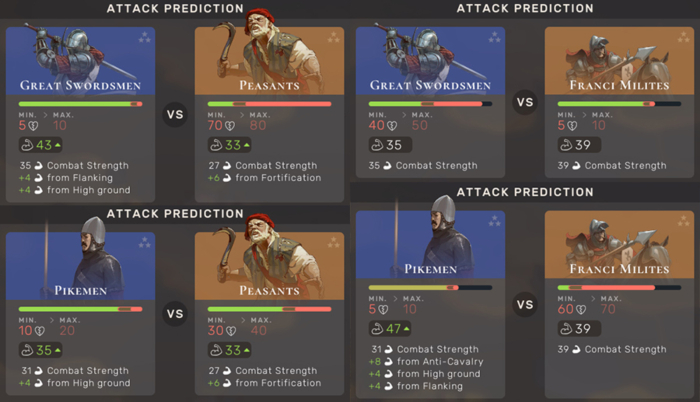 특히 유닛 상성과 지형 보너스는 압도적인 전력 차이를 뒤집을 수 있는 강력한 효과를 제공한다. 예를 들어 '파리 공성전'에서 사용 가능한 '대검병'은 '농부'와 '석궁병', '궁병'에게 높은 피해를 입힐 수 있지만, '기병'에게 쉽게 당한다. 반대로 파이크병은 일반 유닛에게 큰 피해를 주지 못하지만, 대기병 보너스를 가지고 있어 기병을 단숨에 처치할 수 있다.