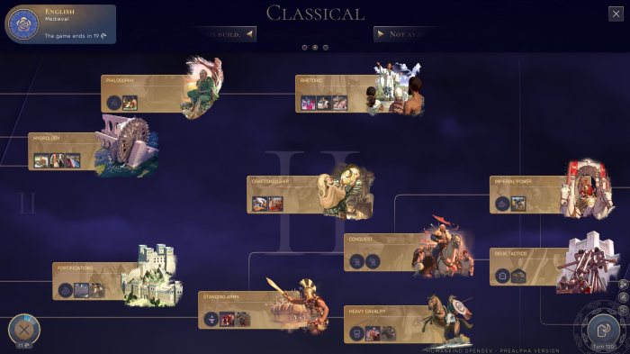 기술 발전표는 문명 시리즈와 같은 방식. 즉, 하위 기술을 연구해 상위 기술을 해금하는 것이다. 다만 여러 선행 기술 중 하나만 연구해도 다음 기술을 익힐 수 있기 때문에 주변 상황에 따라 유연하게 기술 연구 방향성을 바꿀 수 있다.