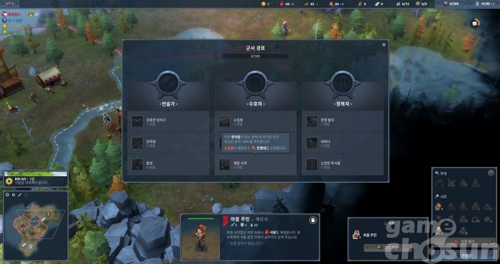 처음에는 자동으로 생산되는 '마을 주민' 밖에 없지만, 정찰병 야영지나 나뭇꾼의 오두막, 훈련소를 건설해 거주민에게 직업을 부여할 수 있다. 이렇게 만든 '정찰병'을 이용해 주변 구역을 탐색하고, 식량을 사용해 지역을 점거할 수 있다. 지역마다 건설 가능한 건물 숫자가 제한됐고, '석재'와 '철' 같은 희귀 자원은 그 수가 제한됐기 때문에 영토 확장은 이 게임에서 무엇보다 중요한 요소다.