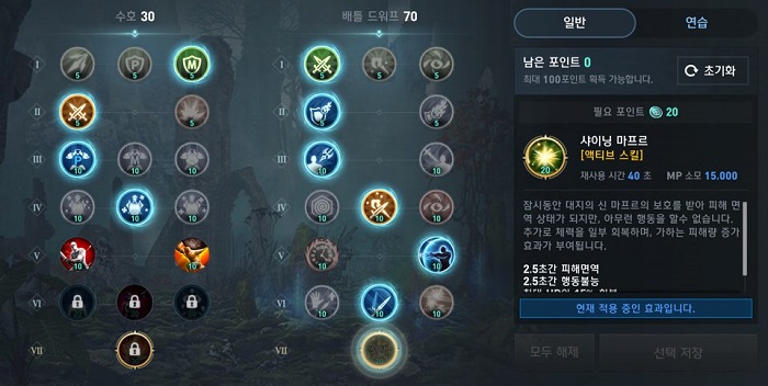 샤이닝 마프르가 절대 무적 판정이긴 하지만 사용 도중에는 행동불능이라 후상황이 꽤 위험할 수 있는 스킬인데요. 가디언의 경우 럭키 덱스터리티로 이를 2번 연속으로 사용할 수 있고 당연히 회복 물약과 같은 각종 소모품의 쿨타임을 한 번 더 돌려서 역습을 가하거나 시간차를 두고 들어오는 레어 스킬을 방어하여 우위를 점할 수 있습니다.
