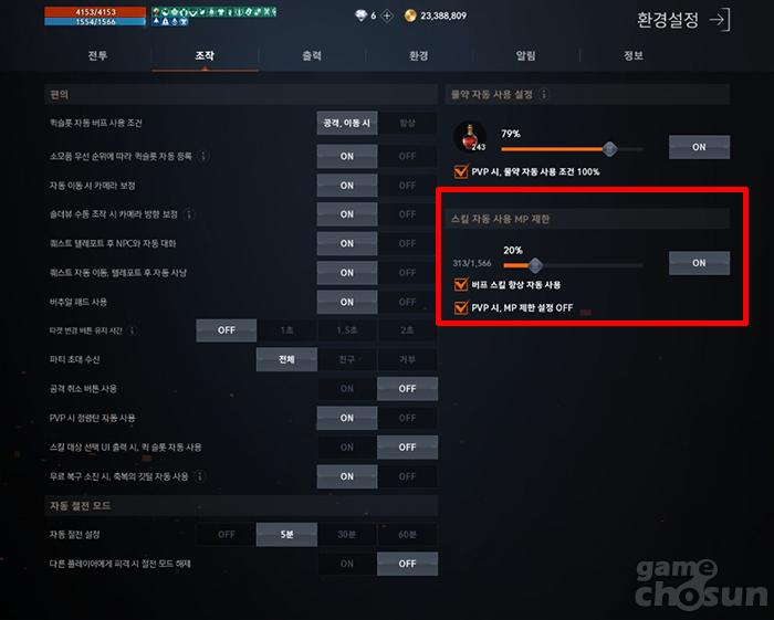 굳이 쟁을 하지 않는 유저라도 충분히 유용하게 사용할 수 있다. '버프 스킬 항상 자동 사용'을 활성화 해둔 상태에서 제한을 낮춰두면 MP 제한이 되지 않은 상황에서는 스킬을 자유롭게 쓰다가도, 제한에 걸리는 순간에는 버프 스킬 이외에는 스킬을 사용하지 않게 된다. 이 기능을 켜두지 않은 플레이어라면 공격 스킬을 자동으로 쓰다가 버프 스킬을 사용할 MP까지 공격 스킬로 사용해 장시간 버프 스킬을 사용하지 못한 채 사냥을 해 효율이 떨어질 수 있다. 자신의 버프 스킬을 모두 사용할 수 있을 정도의 MP를 최저 제한으로 걸어두는 것이 사냥 효율을 높이는 지름길이다.