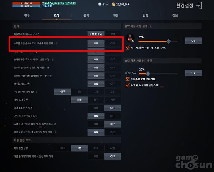이러한 불편함도 해결해 주는 기능이 존재한다. 바로 '소모품 우선 순위에 따라 퀵슬롯 자동 등록' 기능이다. 이 기능을 켠 상태에서 관련 아이템을 자동 슬롯에 올릴 경우 자동적으로 동일 옵션 중 가장 우선 순위가 높은 아이템이 자동으로 등록되며, 그 아이템을 다 사용할 경우 동일 옵션 중 다음으로 우선 순위가 높은 아이템이 자동으로 등록된다. 이 때문에 동일한 효과를 가진 아이템은 하나의 슬롯으로 손쉽게 관리할 수 있다. 동일 아이템 끼리는 클립 표시가 생기기 떄문에 관리도 훨씬 편해진다.