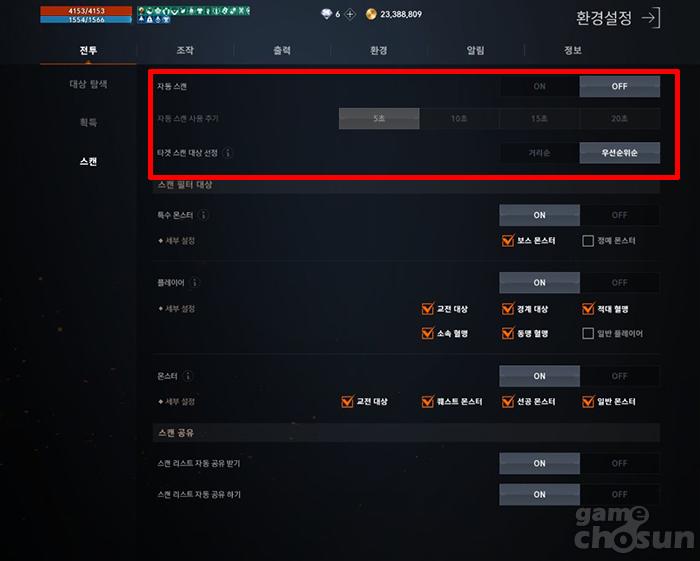 자동 스캔은 환경설정>전투>스캔에서 온오프 할 수 있으며, 자동 스캔 사용 주기와 스캔 대상 순위 등을 세부적으로 조정할 수 있다.