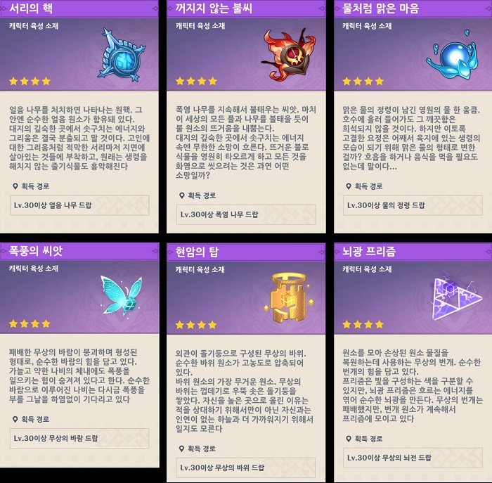 캐릭터마다 모아야 하는 재료가 제각각 다르지만 같은 속성의 캐릭터라면 공통으로 사용하는 재료도 있으며 이는 특정 엘리트 몬스터를 잡으면 나오는 토벌의 꽃에서 퓨어 레진 40을 소모해 획득할 수 있다.