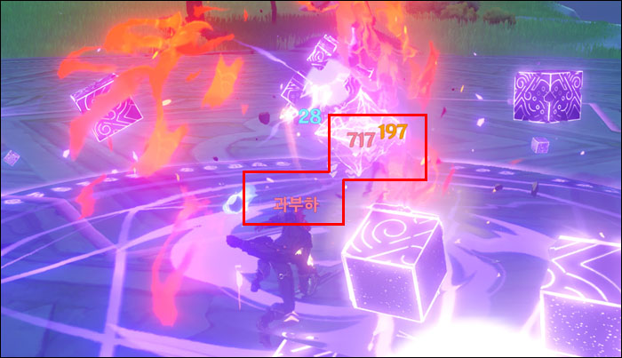 전기 속성 적에게 불 속성으로 공격해 '과부하' 추가 대미지를 주는 모습