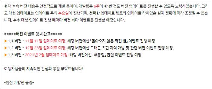 미호요는 공식 카페를 통해 6주 단위의 콘텐츠 업데이트를 발표하고, 즐길거리가 풍부한 게임을 유지하겠다는 의지를 밝혔는데 콘텐츠 소모하기로 세계 최고 수준인 한국 게이머를 만족하기에는 다소 부족해 보인다. 얼마나 풍성하고 빠른 업데이트를 유지할 수 있는지가 인기 유지의 핵심이 될 것으로 보인다.