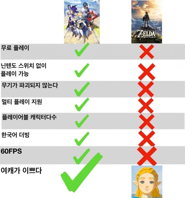 원신이 젤다야숨을 차용한 부분이 많다는 것은 그만큼 젤다야숨이 명작이라는 반증이고, 그 시스템을 일부 차용한 원신도 그만한 재미가 녹아있다는 뜻이기도 하다. 원신은 무조건적인 표절작을 만들기보다 원소조합, 캐릭터 변경 등 자신만의 색을 입혀 새로운 게임을 탄생시켰다.