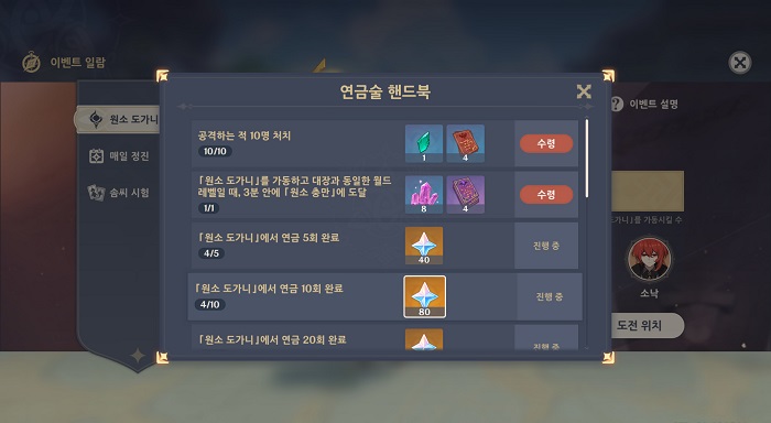 원소 도가니 이벤트는 19일까지 진행하며 모험 등급 20을 달성하고 ‘프롤로그(몬드 지역 메인 퀘스트) 2막 - 눈물 없는 내일을 위해’까지 완료했다면 몬드성에 있는 연금술사 데마우로스에게 ‘연금술의 거대한 돌파구?’라는 퀘스트를 받을 수 있다.