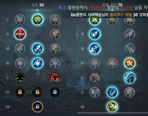 배틀마스터리는 배틀휴먼 70포인트, 집중에 30포인트 투자 햇습니다. 배틀휴먼에 무게중심을 둔 이유는 앞서 여러번 언급한 단점 '기동력의 부재'를 배틀휴먼 최종 스킬인 버프 '윈드드라이브(공격/이동속도 20%)'로 어느정도 무마할 수 있기 때문입니다.