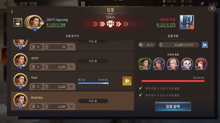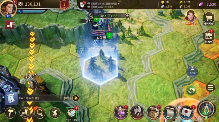 영지에서 벗어나 세계 무대로 나가면, 또다른 콘텐츠가 펼쳐진다. 같은 길드에 속한 이용자가 힘을 합쳐, 모든 이용자의 적이라할 수 있는 아르곤 캠프 혹은 주성을 공격할 수 있으며, 적대 길드를 공격해 약탈할 수도 있다. 또, 영지 주변의 빈 땅을 공격해 추가적인 자원 획득도 가능하며, 자원지에서는 철과 목재 등 귀중한 자원 채집도 할 수 있다.