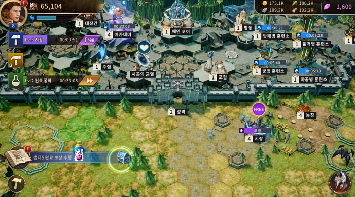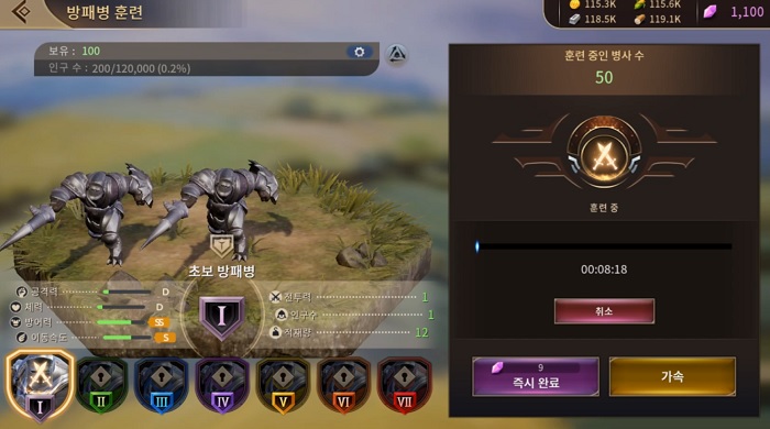 마지막으로 훈련소는 병력을 생산하는 시설인데, 병종은 방패병과 돌격병, 마공병, 궁병 등 네 가지로 분류된다. 각 병종은 상성을 가지고 있음에 따라 적의 진영을 파악하고 적절한 조합을 통해 전투하는 전략을 펼칠 수 있다.