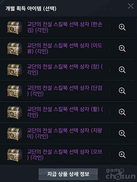 대신 게임 내 기본 시스템으로 최대 2개의 전설 스킬북을 구할 수 있다. 하나는 아덴성에서 5억 아데나에 판매하는 전설 스킬북이며, 나머지 하나는 68레벨 도달 시 명예의 훈장으로 구매하는 전설 스킬북이다. 이중 5억 아데나에 판매하는 전설 스킬북은 로얄 마스터리로 고정이 돼 있으나, 명예의 훈장으로 구매 가능한 전설 스킬북은 드랍이나 제작 등으로 획득할 수 있는 전설 스킬 3종 중 1개를 선택해 습득하는 방식이다.
