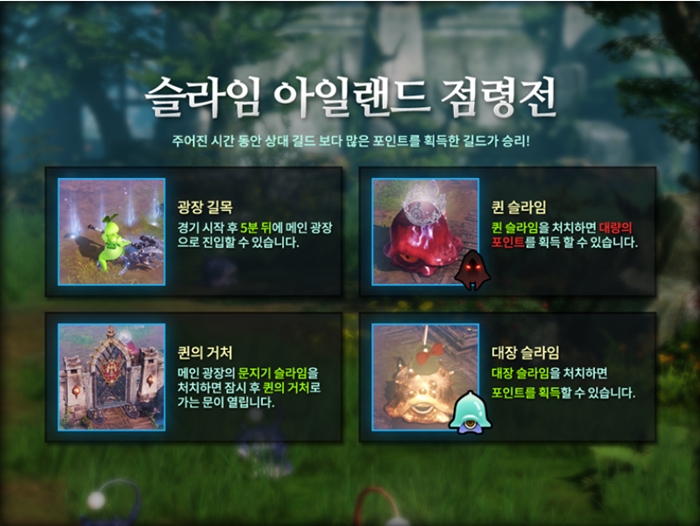 하지만 경기 시작 5분뒤부터 진입 가능한 메인 광장에서 등장하는 ‘퀸 슬라임’과 섬 곳곳에 3마리가 존재하는 ‘대장 슬라임’을 누가 먼저 처치하는지가 승패를 결정짓는 중요한 변수로 작용한다. 퀸 슬라임의 경우 현재 기준 300포인트라는 높은 포인트를 제공하며 처치 시 작은 퀸 슬라임 2마리로 분열하기 때문에 메인 광장을 확실하게 장악하고 있다면 대량의 포인트를 한번에 획득 할수 있다.