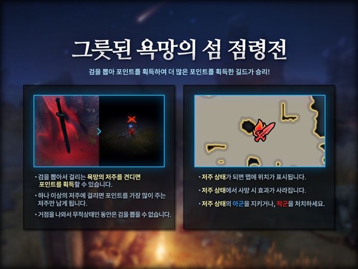 그릇된 욕망의 섬은 포인트 획득 방식의 PVP 전투로 진행된다. 유저들은 PVP외에도 맵 곳곳에 일정 주기로 생성되는 저주받은 검을 뽑아 포인트를 획득할 수 있다. 저주받은 검을 뽑으면 시간이 지남에 따라 지속적으로 포인트를 획득할 수 있지만 각종 디버프 패널티를 받아 전투가 굉장히 힘들어진다. 더불어, 저주 상태에서는 항상 맵에 위치가 표시되기 때문에 상대 길드의 첫번째 표적이 된다.