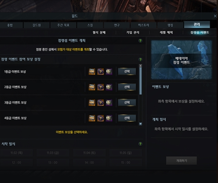 S급 섬인 ‘메데이아’와 ‘슬라임 아일랜드’를 점령한 길드에게는 아주 특별한 혜택이 주어진다. 바로 해당 섬에서 서버의 모든 유저를 대상으로 한 이벤트를 개최할 수 있는 권리다. 이 ‘점령 이벤트’는 점령 길드의 길드장이 길드 혈석을 소모해 주 1회만 개최가 가능하다. 길드장은 이벤트의 종류와 보상 범위를 결정할 수 있으며 알람과 캘린더를 통해 모든 유저에게 공지된다.