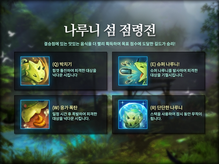 현재 유저들에게 가장 좋은 반응을 얻고 있는 ‘나루니 섬 점령전’의 경우 유저들의 캐릭터가 나루니 섬에 살고 있는 고유 생명체 ‘나루니’로 변신해 경주를 펼치는 방식으로 이루어 진다. 나루니로 변신하면 원래 가지고 있던 스킬 대신 나루니만의 특수 스킬 4가지를 사용할 수 있게 되고 해당 스킬을 사용해 결승점에 있는 음식을 더욱 많이 먹은 길드가 섬을 점령하는 방식이다. 사실상 게임 속에서 즐기는 하나의 미니 게임과 같은 완성도를 자랑하며 각각의 섬 점령전 모두가 이런 색다른 방식으로 전투가 이루어 진다.