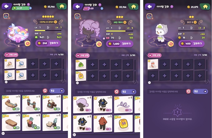 가구, 복장, 인형 아이템의 강화 과정