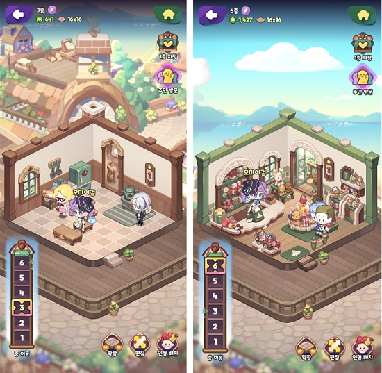 마술양품점에는 공간을 가로로 확장하는 것 외에도 ‘증축’ 시스템을 통해 층을 위로도 올릴 수 있다. 증축을 통해 층마다 다른 테마로 자유롭게 꾸밀 수도 있고, 종업원인 ‘인형’을 배치할 수 있다. 인형은 시간마다 재화와 아이템을 생산하기 때문에, 층이 올라갈 수록 더 많은 공간을 운영하고 재화도 더 벌어들일 수 있다.