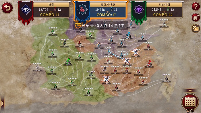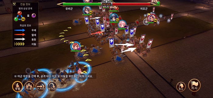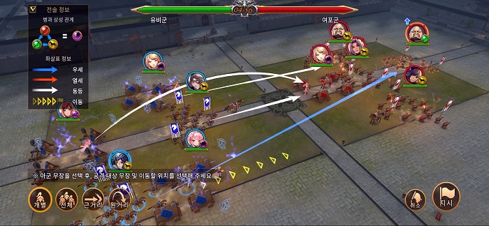 전투 진행 도중에 전술 지시 시스템을 활용해 언제든지 실시간으로 전황에 대한 확인 및 새로운 전술을 펼칠 수 있다. 체력이 낮은 부대를 일점사 해 우위를 점할 수도 있고, 기병으로 상대방 진영을 휘저은 후 후퇴하면서 유인 당한 적 부대를 궁병이나 투석기병이 처리하는 등 실시간 부대조작으로 유저가 직접 다양한 전략전술을 구사할 수 있다. 무장 등장, 스킬 발동 시 수준 높은 애니메이션 컷인 연출은 이 같은 전투에 박진감을 더하여 짜릿한 손맛과 함께 백미를 더한다. N등급 무장도 '무장의혼' 수집을 통해 최고 등급인 LE등급까지 육성할 수 있기에, 버려지는 무장 없이 유저의 전략 스타일이나 선호 무장에 맞춰 다양한 덱을 구성하는 게 가능하다. 무장의혼은 무장 소환뿐만 아니라, 시나리오 '외전' 플레이, 교환소 등 다양한 루트를 통해서도 획득할 수 있어, 유저들은 무장 수집과 육성에 대한 스트레스 없이 원하는 덱 구성에 집중할 수 있다.