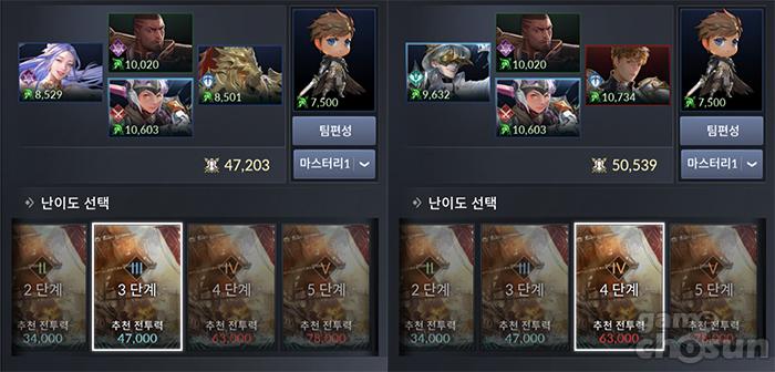 3단계(좌측) / 4단계(우측)를 여유롭게 클리어할 수 있는 파티 구성 = 게임조선 촬영