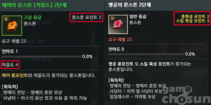 서포터즈 테스트(좌)와 달리 게릴라 테스트(우)의 룬 스톤은 무조건 스킬 특성 포인트를 준다 = 게임조선 촬영