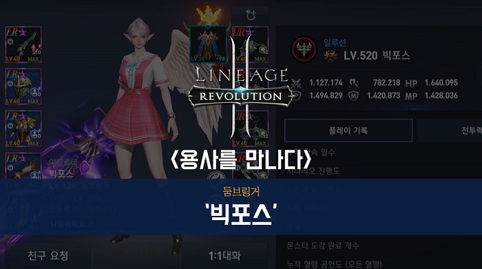 안녕하세요. 이실로테 서버의 일루션 혈맹에서 활동 중인 '빅포스'라고 합니다. 현재 '둠브링거'를 육성하고 있습니다.