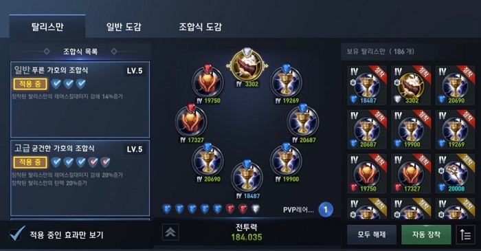 우선 탈리스만은 '신성한 가호' 조합식으로 사용합니다. 둠브링거는 공격력이 높은 편에 속하므로, '신성한 가호' 조합식으로 방어력을 챙겨주는 편입니다. '신성한 가호' 조합식을 사용했을 때 대규모 쟁에서 좀 더 높은 효율을 냅니다.