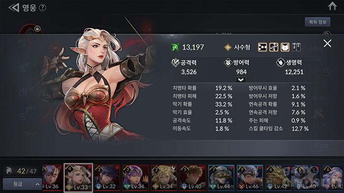 스킬을 보면 알겠지만, 9레벨 기준 딜량은 284%, 284%, 142%, 684%로, 보통 희귀 등급 공격형 영웅이 9레벨 기준 400% 이상의 딜량을 뽑아내며 자가 버프기도 가지고 있는 것을 보면 애당초 딜을 기대하기는 영웅이라고 보는 것이 좋다.