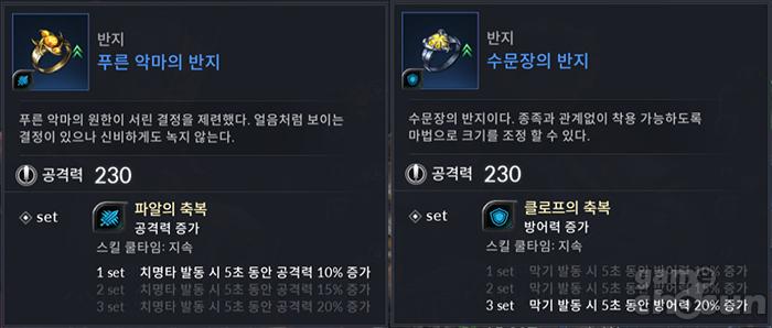 영웅 스킬과 별도로 장신구에서도 이로운 효과가 발동되는 경우가 있어 선정에 주의가 필요하다. 희귀 등급 장신구부터는 '막기 시' 또는 '치명타 시' 발동하는 장신구가 존재하는데, 이러한 장신구는 모두 이로운 효과로 적용해 케르베로스가 흡수하기 때문에 해당 장신구는 모두 장착 해제하고 단순 피해량 증가, 피해량 감소 등의 옵션으로 교체해야 한다.