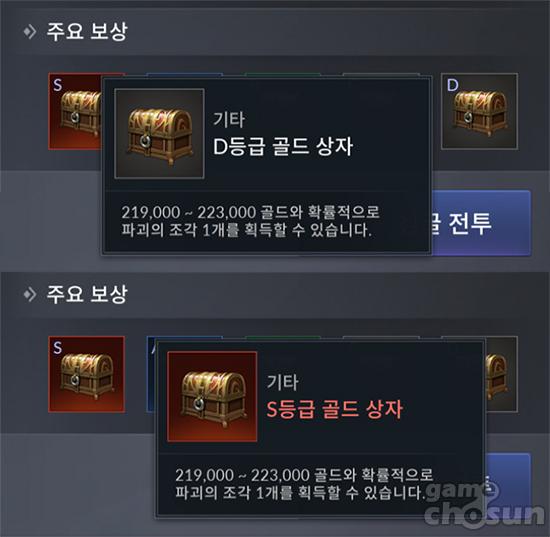 8단계 D 골드 상자와 7단계 S 골드 상자가 동일한 수치다. = 게임조선 촬영